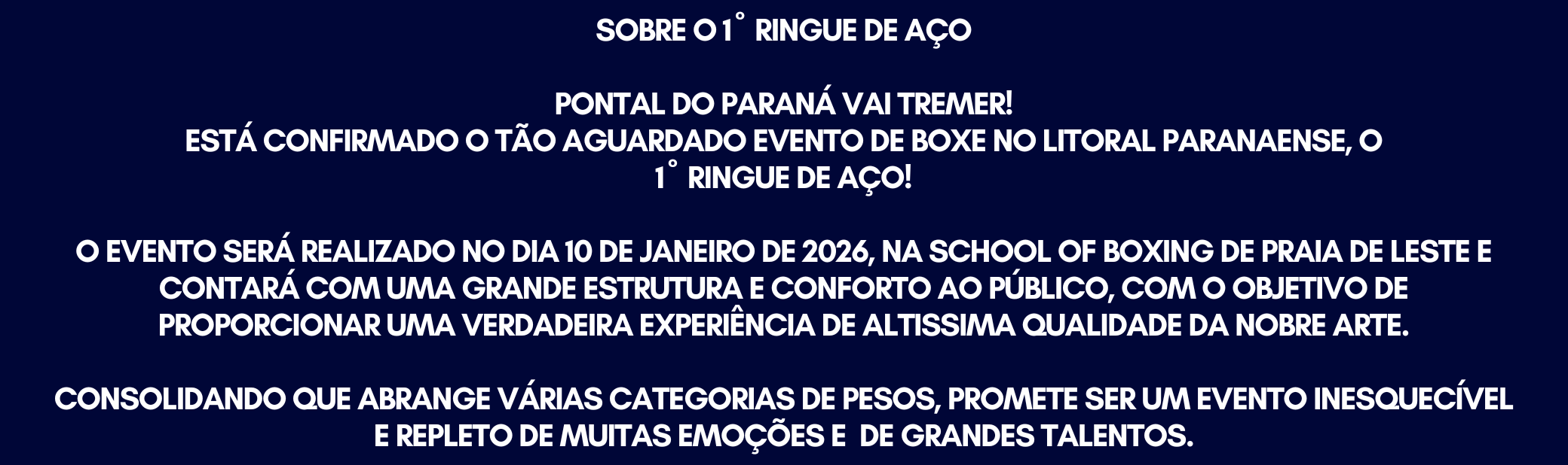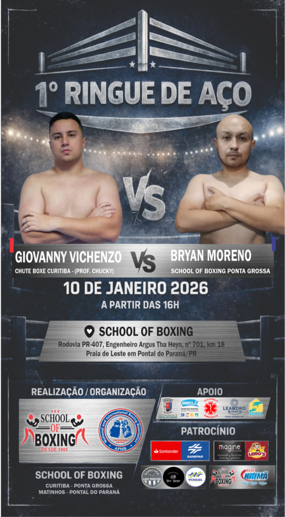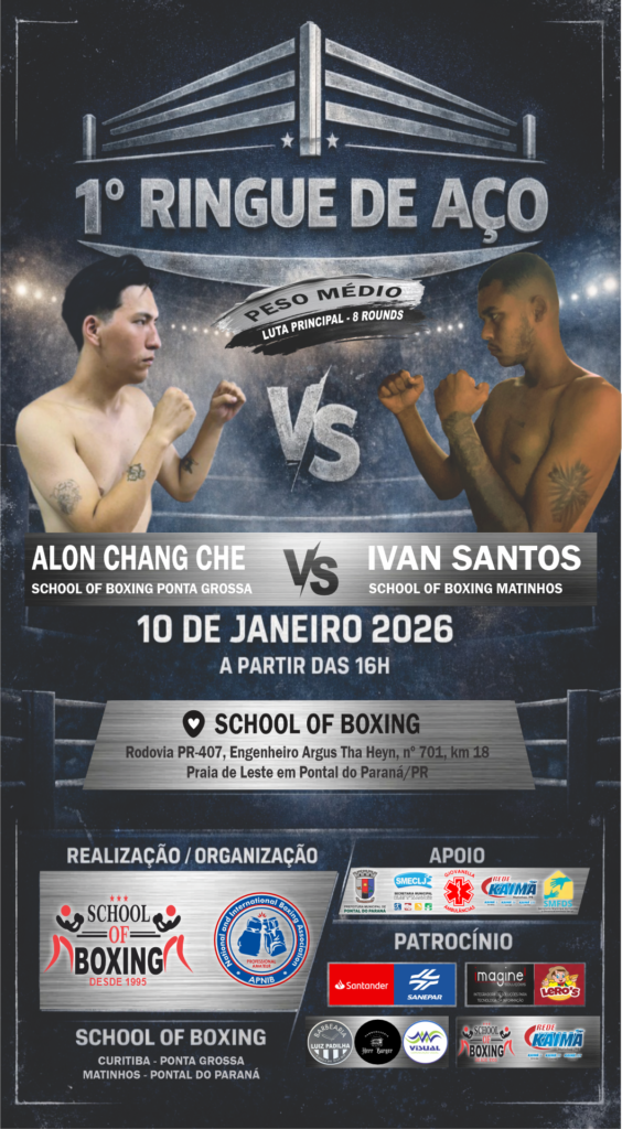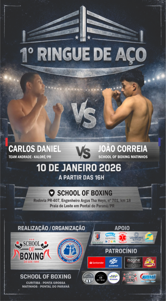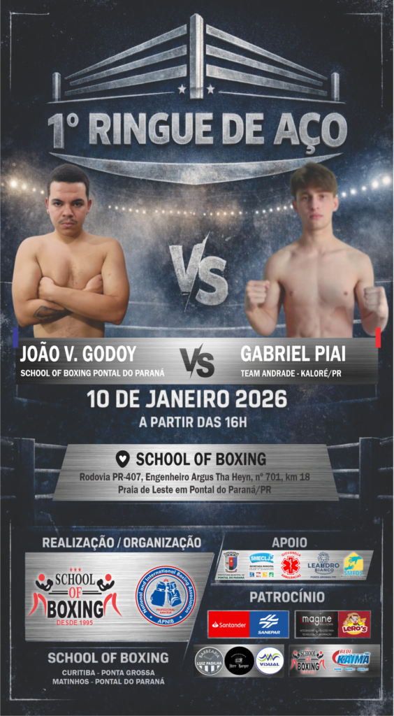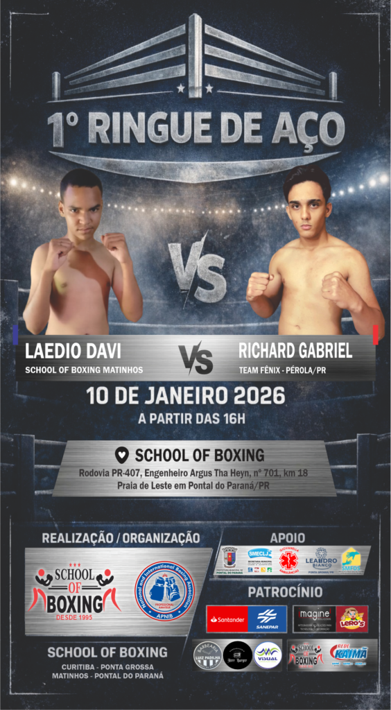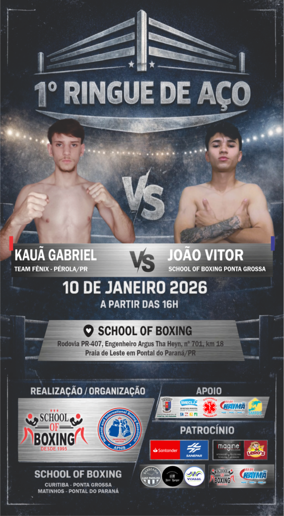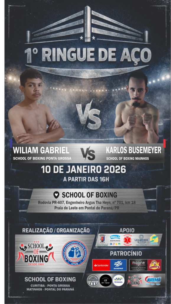 É com grande satisfação e honra que a School of Boxing / APNIB – Associação de Pugilismo Nacional e Internacional de Boxe tem o prazer de convidar a todos para prestigiar o 1º Ringue de Aço, evento esportivo de boxe que será realizado no dia 10 de janeiro de 2026, às 16h, nas dependências da School of Boxing, no município de Pontal do Paraná/PR.